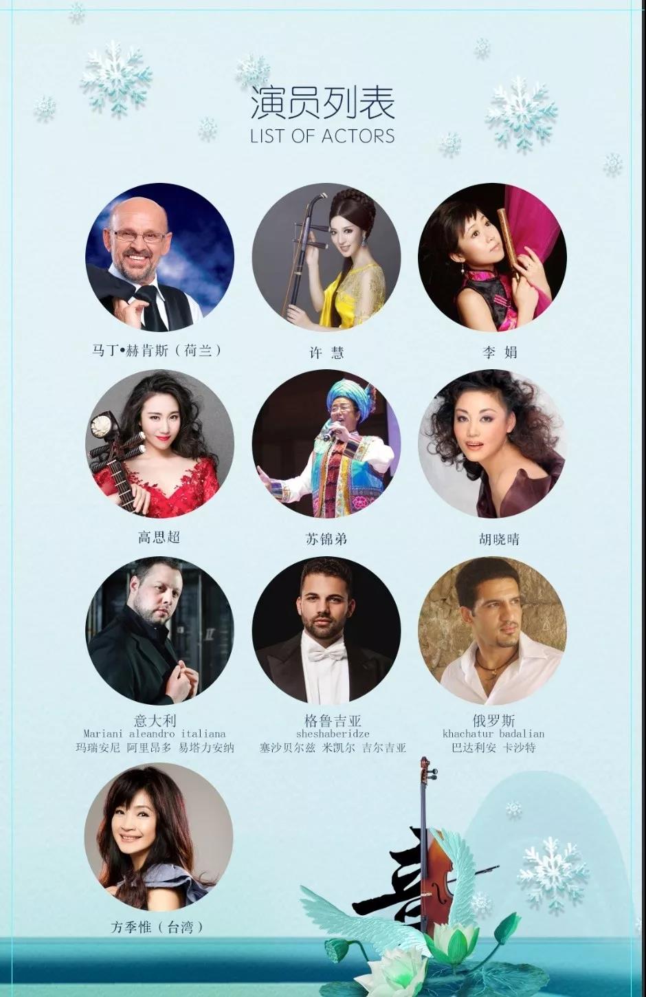 音乐会将邀请红遍世界的“荷兰好声音”的冠军马丁·赫肯斯以及世界新三大男高音演绎《我的太阳》、《今夜无人入睡》等观众耳熟能详的歌曲,演出阵容还包括2009年世界小姐及中央电视台CCTV-3《星光大道》双料冠军、非洲女黑人歌手--玛丽亚·凯克(塞拉利昂),华人第一个在奥斯卡电影颁奖典礼走红毯的华人演员--方季惟(台湾),中国著名女高音歌唱家,被称为“百变歌后”--胡晓晴,我国著名的少数民族音乐家,被誉为“白族人民自己的歌唱家”--苏锦弟,青年琵琶演奏家--高思超,中国广播民族乐团青年竹笛演奏家--李娟,十大青年二胡演奏家--许慧等以体现音乐会的国际性和规格。