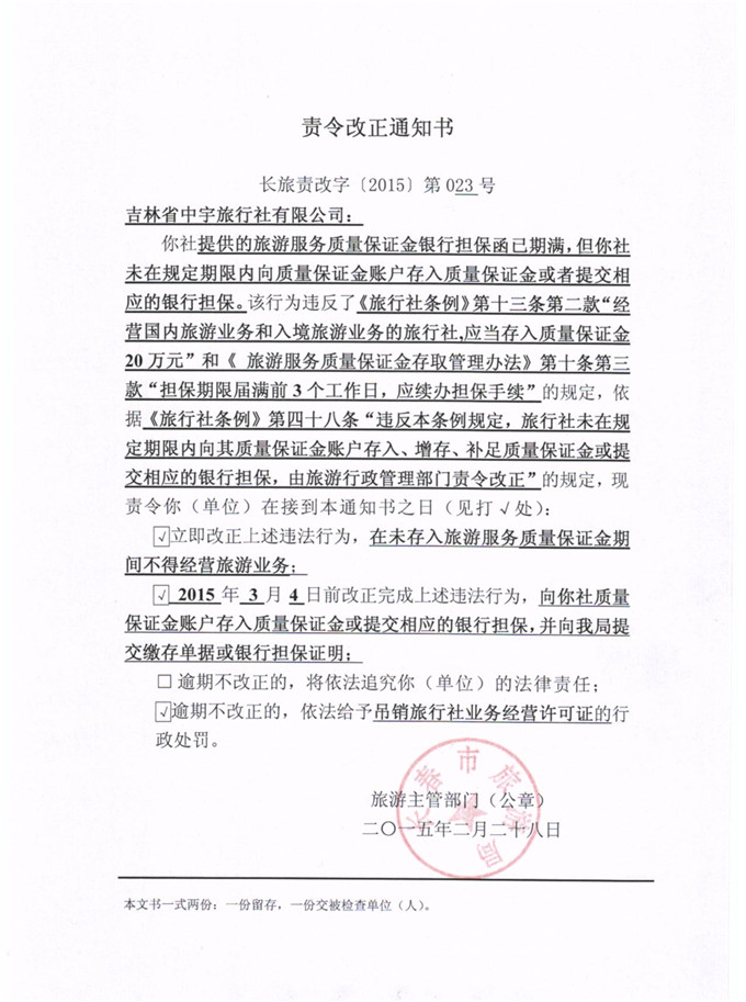 责令改正通知书吉林省中宇旅行社有限公司